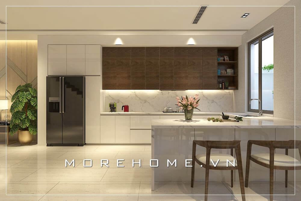 Thiết kế nội thất phòng bếp hiện đại sử dụng tone màu nâu - trắng tạo điểm nhấn, hài hòa với không gian nhà biệt thự