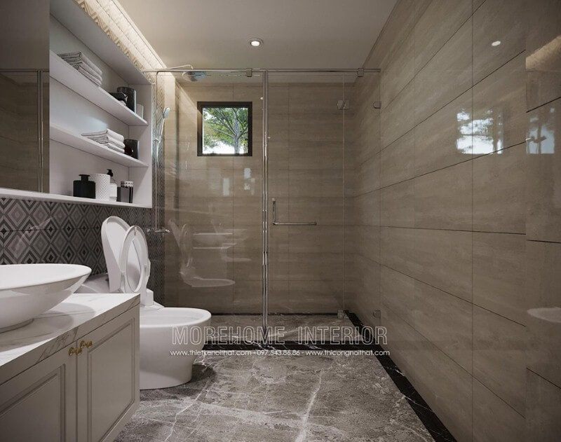 Phòng tắm kính cường lực đẹp, sang trọng với thiết kế hiện đại, mở ấn tượng.