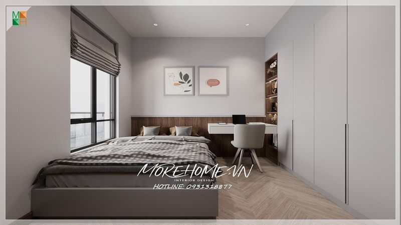 Thiết kế nội thất chung cư với phòng ngủ con hiện đại, gỗ công nghiệp được sử dụng cho không gian phòng ngủ này, từ chiếc giường đến tủ áo, bàn học,..