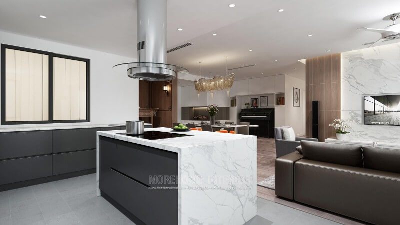 Mẫu bàn đảo bếp gỗ công nghiệp, mặt bàn ốp đá màu trắng cao cấp giúp người tiện nghi tiện lợi hơn trong công việc nấu nướng, đồng thời tạo vách ngăn chia khu vực phòng bếp - ăn