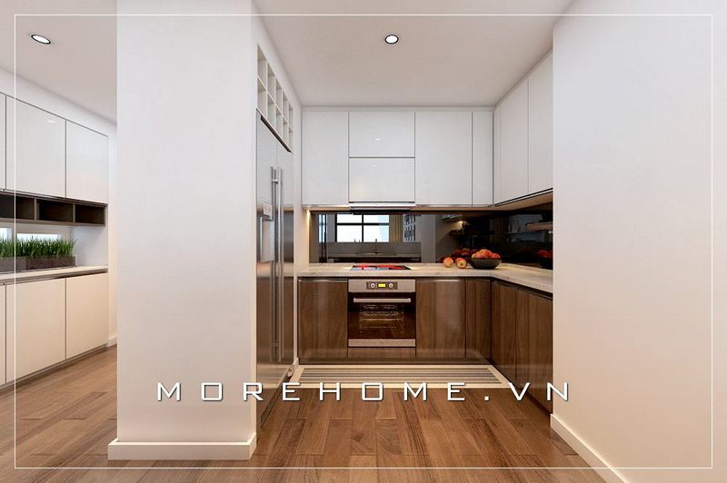Phòng bếp được thiết kế theo hình chữ U với nội thất gỗ công nghiệp hiện đại và đẹp mắt.