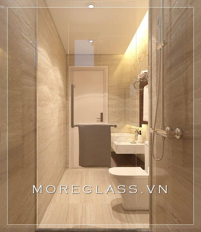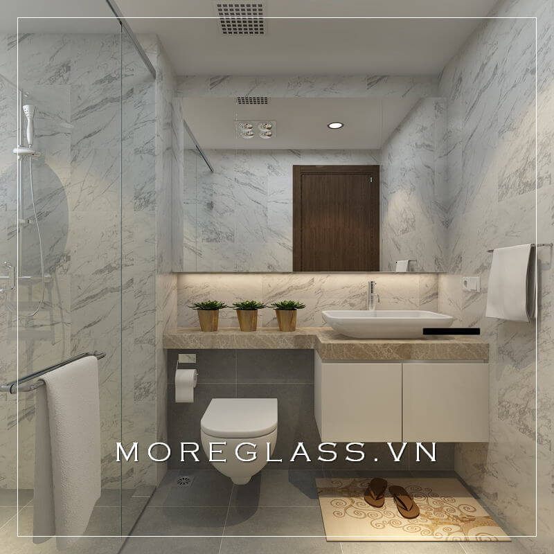 Phòng tắm hiện đại được thiết kế với những kệ tủ trang trí, tủ lavabo đơn giản nhưng hiện đại, cùng với các thiết bị vệ sinh và phòng tắm kính đẹp.