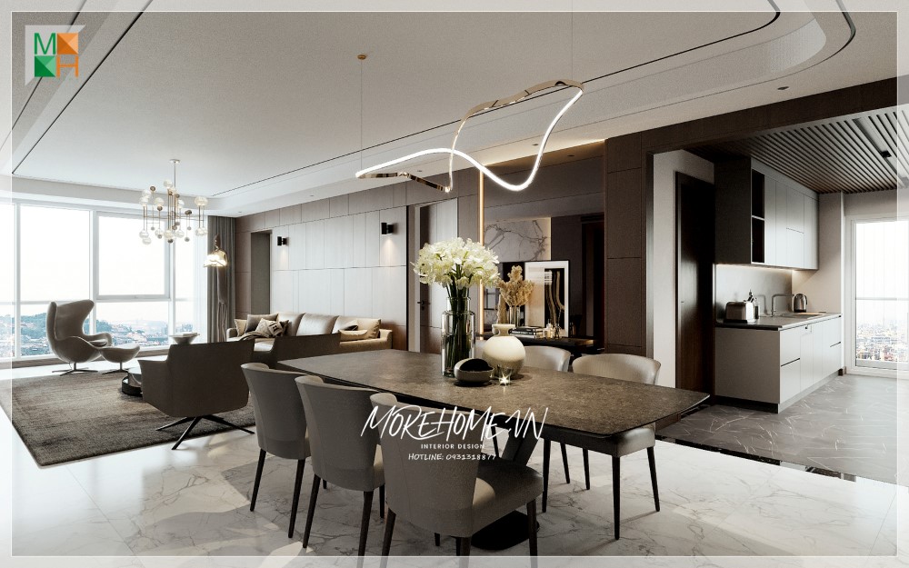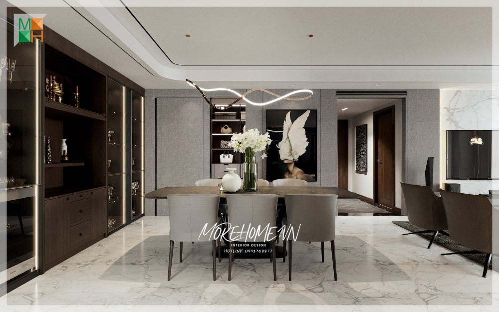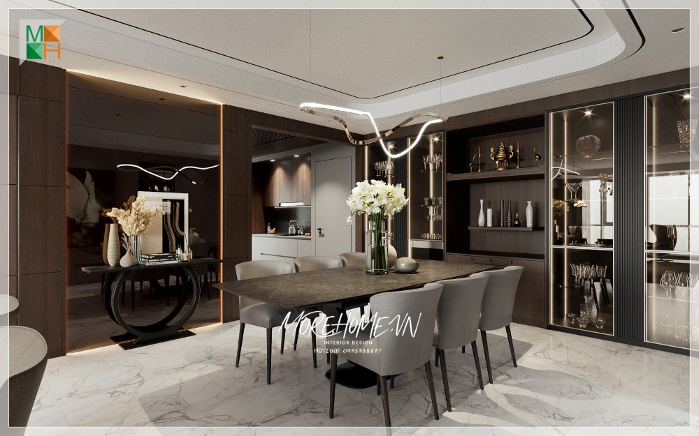 Không gian phòng ăn được trang bị nội thất hiện đại và phù hợp với cá tính của gia chủ, giúp cho quá trình sử dụng sinh hoạt hằng ngày trở nên dễ dàng hơn.
